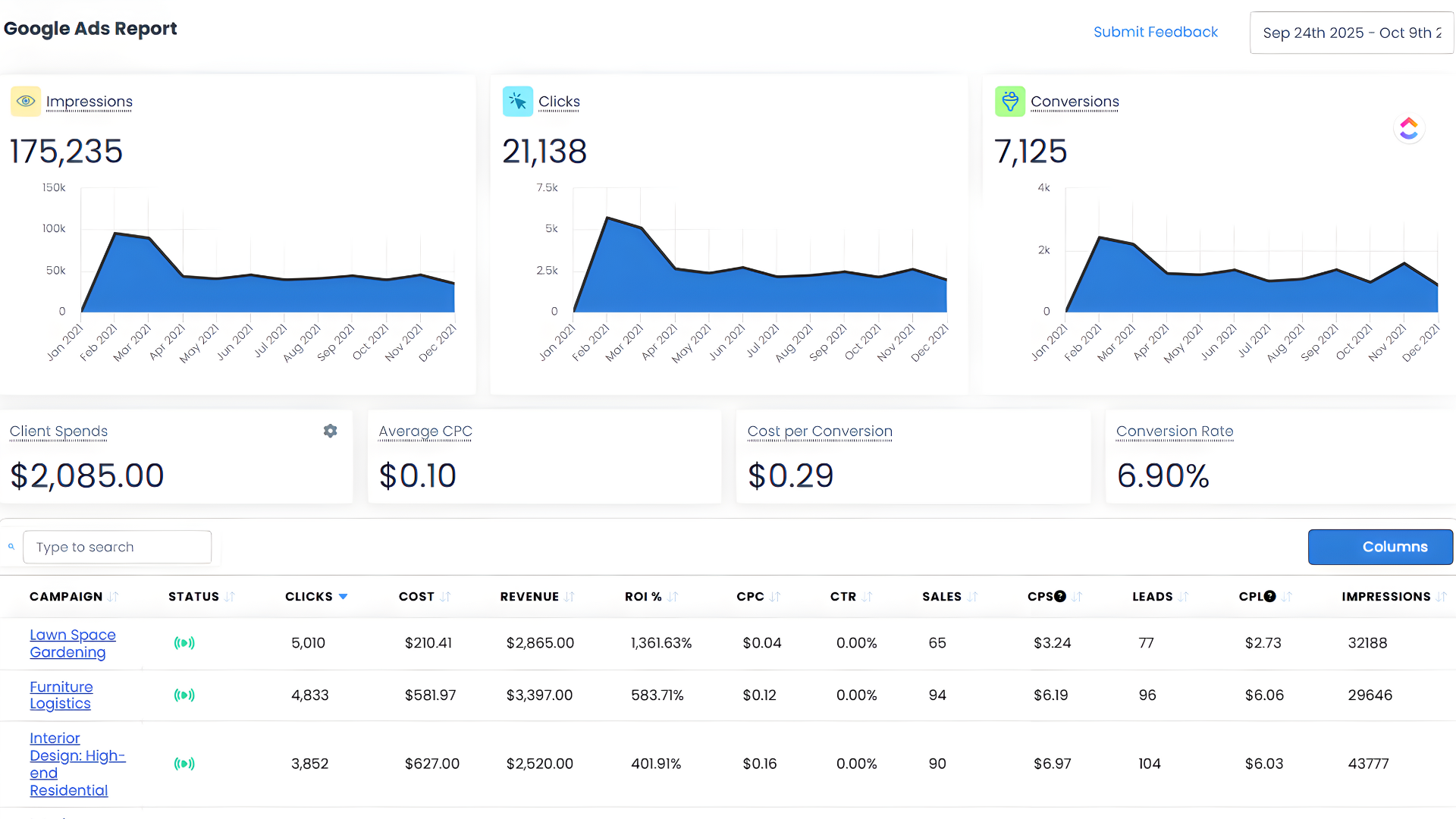 Connect your ad accounts and view performance in one place. Track impressions, clicks, and conversions with real-time ROI reporting your clients actually understand.